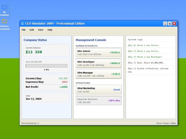It's an economic simulator where you manage a startup, aiming to reach $3 million in capital. In Windows XP style, you hire employees, launch marketing campaigns, and upgrade systems to increase your daily income. Beware of high daily expenses and random events that can lead your company to bankruptcy.