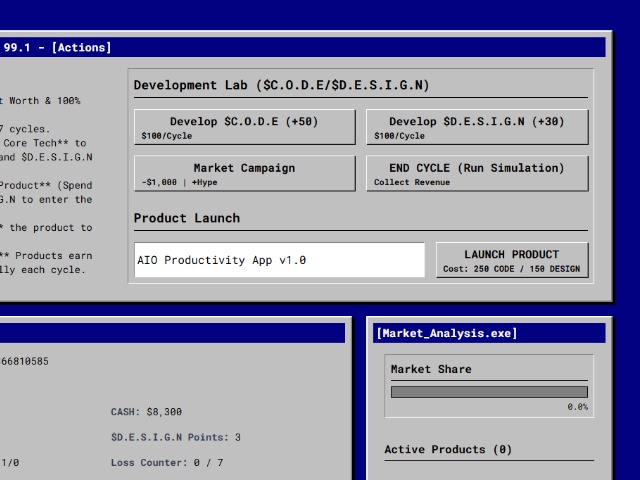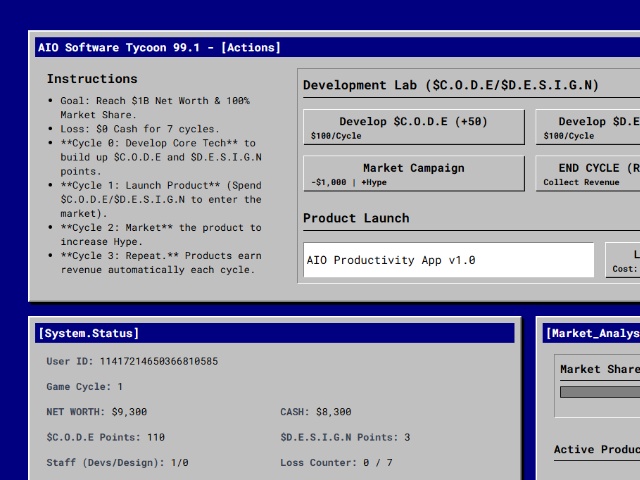 Welcome to AIO Software Tycoon, where you become the founder of a 90s tech empire, styled after Windows 98. Your goal is to reach a net worth of one billion dollars and capture 100% market share. The gameplay is based on cycles: in the first you invest in development
