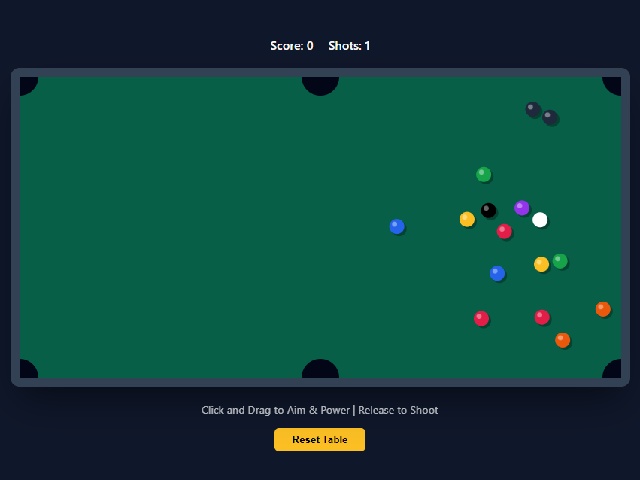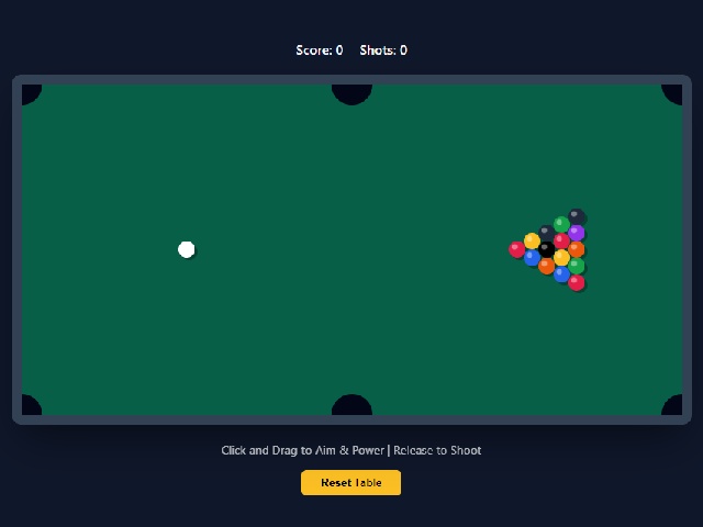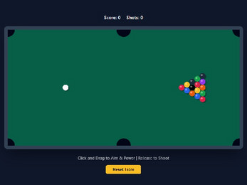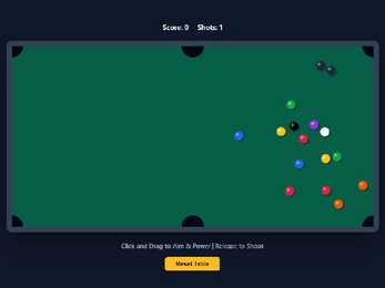 Points are awarded for each pocketed ball and a penalty is given for sinking the cue ball. The goal is to score the maximum points in the fewest shots. The game physics includes ball collisions and friction. It is a calm and meditative game of precision.