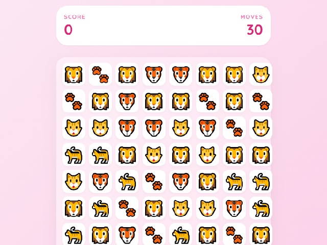 Is a colorful match three game with cat emojis. The player swaps adjacent cat emojis to form lines of three or more identical symbols. Matched cats disappear from the board and award points. The player is given a limited number of moves for the entire game. The goal is to score the maximum points before the moves run out. The game has simple controls and a bright design. It is a light and relaxing puzzle.