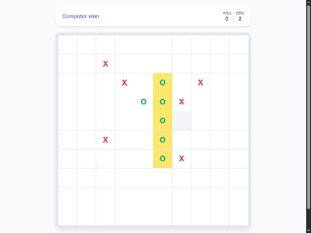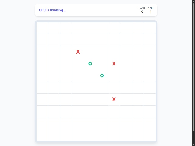 Players compete against a strategic AI that actively blocks and creates its own sequences, offering a challenging single‑player experience. The clean, minimalist interface features smooth animations, subtle hover effects, and distinct colors for player (X) and computer (O). Wins are highlighted with a gentle pulse animation, and a persistent score tracker keeps the competitive spirit alive across multiple rounds