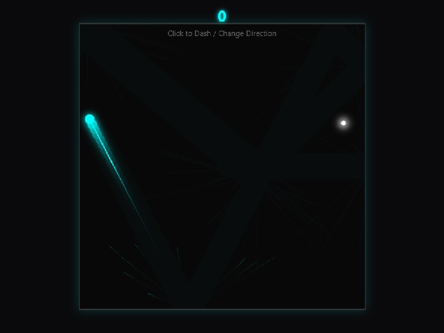 Click or tap to instantly dash in the direction of the cursor, changing your movement trajectory. Each collision with walls triggers a vibrant cyan explosion, and collecting food increases your score. The game ends if an enemy touches you, challenging you to survive as long as possible. With its sleek neon visuals and responsive controls, it offers a thrilling test of reflexes and precision