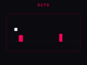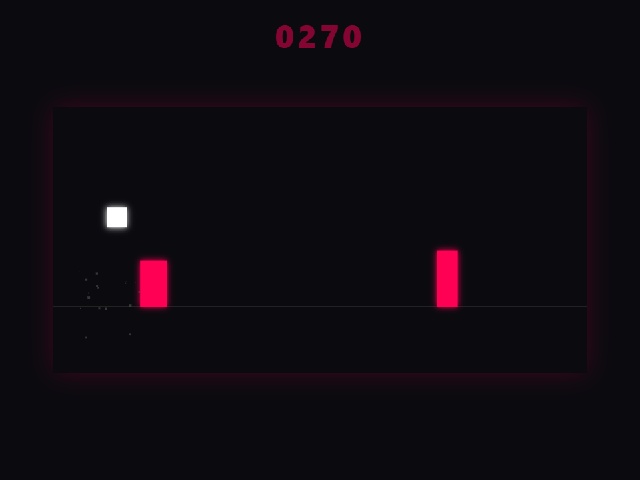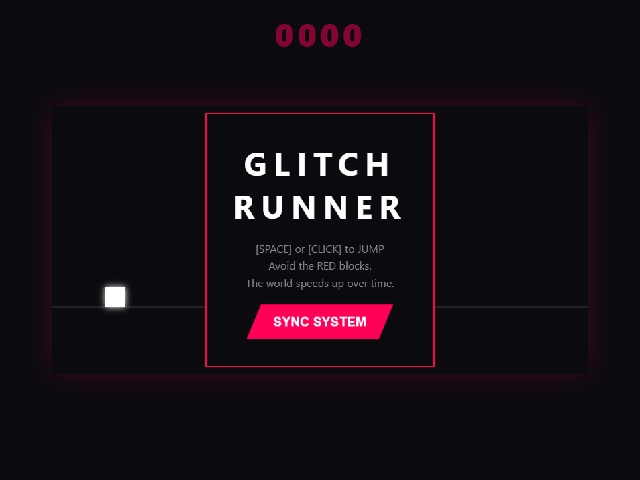 The game "Atom Runner" is a fast-paced endless runner where you control a white glitching cube moving across a dark platform. Players must press space or click to jump over randomly generated red obstacles that scroll toward them. The game progressively speeds up, increasing the challenge over time. A clean neon aesthetic with glitch effects and particle explosions creates a cyberpunk atmosphere. Your score increases with distance, and collision with any obstacle ends the run. Simple one-button gameplay makes it easy to learn but hard to master as reaction times are constantly tested