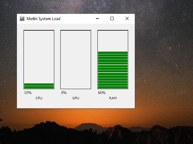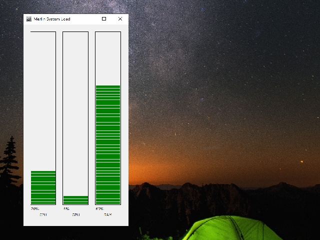 This program displays the current load of the CPU, GPU, and RAM using simple vertical indicators. It shows resource usage percentages in real time without detailed process information or load history. Its functionality is limited to basic visual monitoring of core system metrics