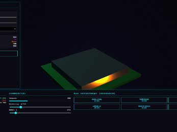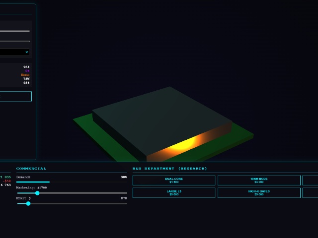 It's a futuristic cyberpunk business simulator where you run a technology corporation, design processor architectures, and research cutting-edge technologies to capture the chip market.