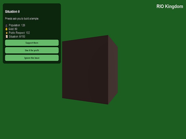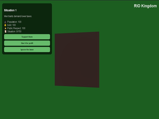 RIO Kingdom is a kingdom simulation game where the player makes decisions in different situations that affect population, gold, and public respect. The game includes 150 situations, and the goal is to keep the kingdom alive until the end without letting any resource drop to zero