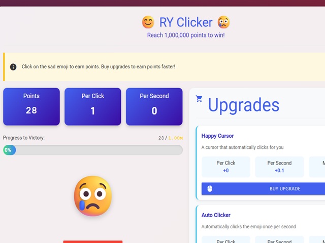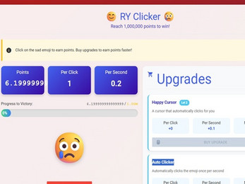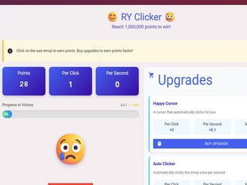 RY Clicker is a simple and engaging clicker game where your goal is to reach 1,000,000 points by clicking on a sad emoji. Each click earns points, and purchasing upgrades helps you gain them faster, including automatically every second. Track your progress, boost your stats, and achieve victory!